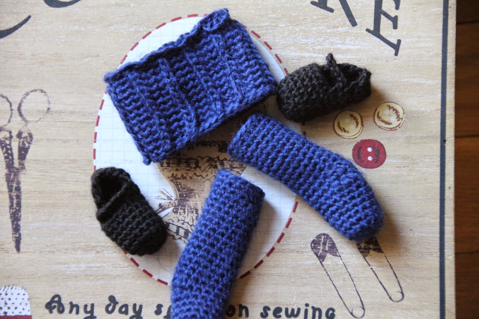 Para tejer la corbata, tejer 5pb durante 12 vueltas y girar. Coser junto con la camisa según la fotografía.