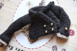 Solo tejemos el final de la camisa en color beige. Montar 13 cad, trabajar 3 vueltas y coser al final de la manga de la chaqueta.