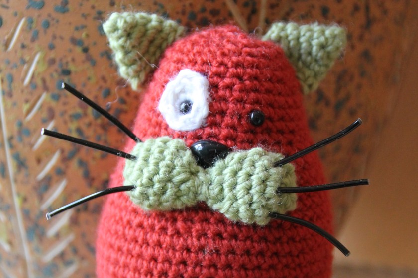 Añadir los bigotitos, cortando 3 tiras de alambre negro y cruzándolo entre los hilos del hocico.