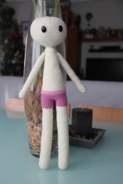 El cuerpo de la muñeca es estilizado, más grande que otros que he tejido para intentar dar más fuerza a las piernas y sostener a la muñeca de pie. Sí pero no.